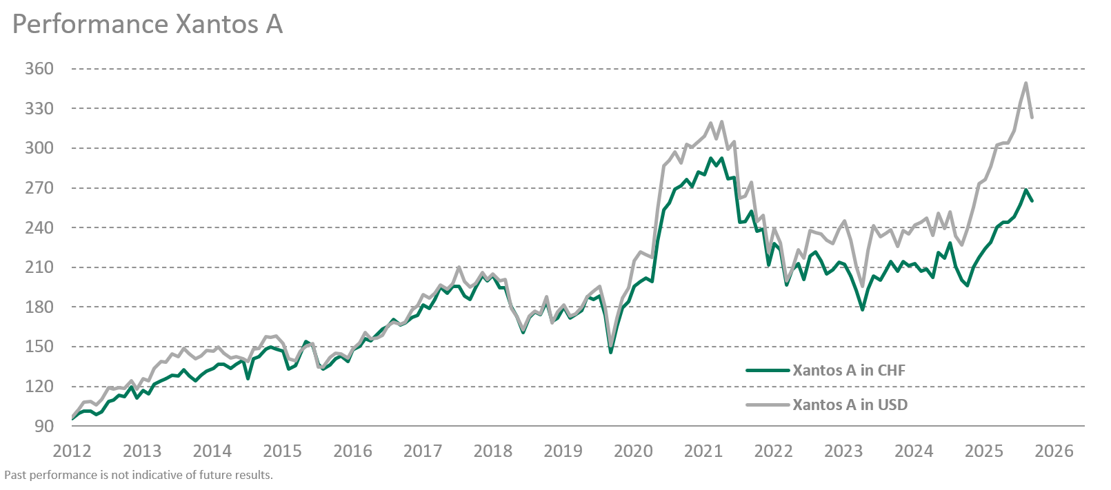 Xantos has a high risk profil. The value of shares in the Fund and income received from it can go down as well as up, and investors may not get back the full amount invested. Performance may also be affected by currency fluctuations. Past performance is not an indicator or a guarantee of future performance. Please consult your financial advisor before deciding to invest. The sub-fund is subject to the tax laws and regulations of Liechtenstein. Depending on your own country of residence, this might have an impact on your investment. For further details you should consult a tax adviser. Shares of this fund may not be sold, offered or delievered to U.S. residents or U.S. citizens.